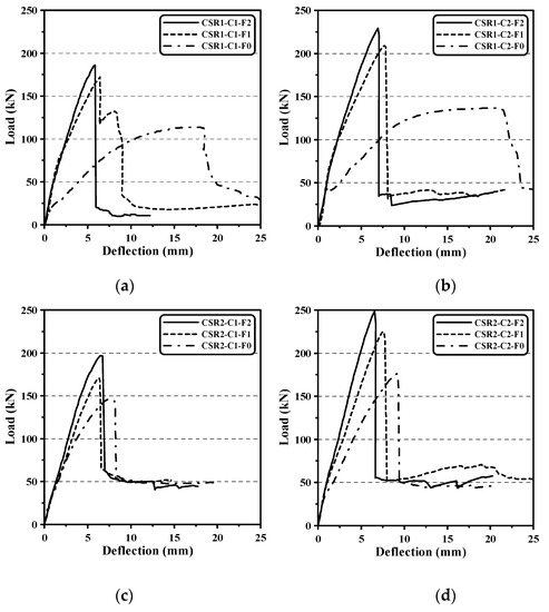 Load-deflection curves: (a) CSR1-C1 series of specimens; (b) CSR1-C2 series of specimens; (c) CSR2-C1 series of specimens; (d) CSR2-C2 series of specimens.