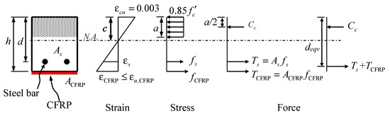 In order to take into account the contribution of the CFRP laminates, among the variables in Equations (1) and (2), the effective depth of the slab section, d, and the flexural strength, , needed to be amended to reflect the strengthening effect of the CFRP laminates [7]. To calculate the flexural strength of the slab strengthened with CFRP laminates, the fundamental theory to calculate the flexural strength of a reinforced concrete member was followed. Flexural strength was determined based on the deformation compatibility and force equilibrium. Figure 8 shows the strain, stress and force distributions in the slab section.