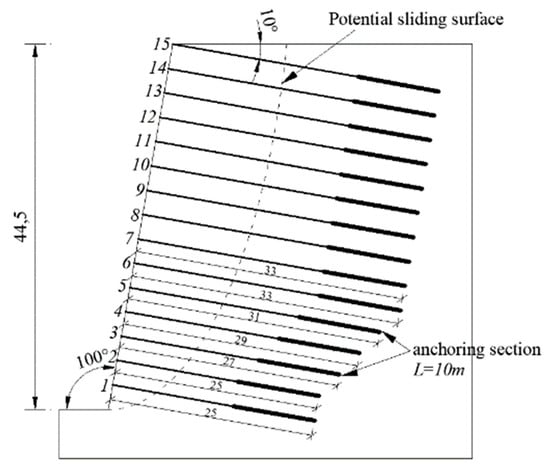 A weakly weathered limestone slope at a gradient of 80° and height of 44.5 m had a pier supporting a highway bridge spanning a gorge at the slope foot, where the rock slope is reinforced using prestressed anchor cables to guarantee the safety of the bridge. Geological exploration showed that the slope was comprised of intact rock, however, to explore the reinforcement mechanism of prestressed anchor cables, the potential sliding surface causing slope instability was calculated in advance by applying the FLAC3D strength reduction method, which was considered as a source of danger from which to explore the effect of prestressed anchor cables. The cables from the slope foot to the slope crest were numbered 1 to 15, respectively. The total lengths of all anchor cables are that cables 1 and 2 have a length of 25 m, cables 3–5 respectively have lengths of 27 m, 29 m, and 31 m, and cables 7–15 have a uniform length of 33 m. The inclination of the anchor cables is uniformly 10°. The anchored section of the prestressed anchor cables had the length of 10 m, on which a 500 kN prestress was applied.