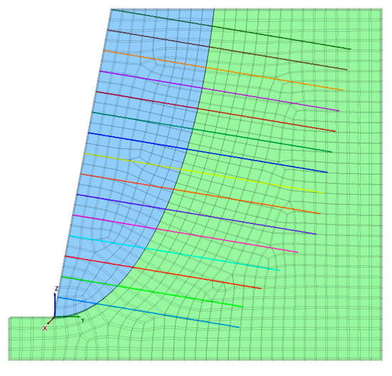 At present, there are two main approaches used for determining the safety factor of a slope based on numerical methods (finite element or finite difference). For the inflection point method, the strength parameters of slope rock and soil masses are reduced according to a certain value to calculate the displacement of a slope foot. On this basis, the relationship between the displacement of the slope foot and the strength reduction factor was drawn and then the strength reduction factor corresponding to the inflection point (a point at which displacement suddenly varies) of the curve functions as the safety factor of the slope [31]. A convergent method [32] was also used wherein the strength parameters of slope rock and soil masses were reduced according to a certain value and whether the calculation can be convergent or not (whether unbalanced force is less than 1.0 × 10−5 or not is regarded as convergence criterion in FLAC3D) is considered as the control standard for slope stability. The corresponding strength reduction factor when the calculation is exactly convergent is considered to be the safety factor for the stability of the slope.