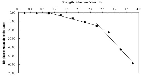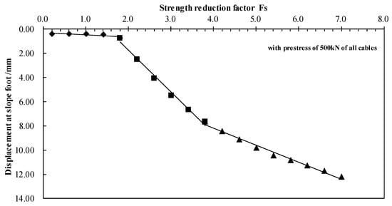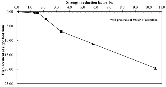 Figure 4 displays the relationship between the displacement of slope foot reinforced by prestressed anchor cables and the strength reduction factor (calculated by applying the inflection point method). The prestress applying on all cables was 500 kN. As shown in the figure, in the presence of prestressed anchor cables, the safety factor of the slope was greatly increased. The point with the strength reduction factor of 1.8 in the figure corresponded to the inflection point of the curve. On the condition that the strength reduction factor exceeded 1.8, the displacement of slope foot rose rapidly, indicating that the safety factor of the slope reinforced by prestressed anchor cables was determined as being 1.8 by using the inflection point method.