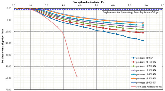Additionally, by comparing the slope reinforced by cables under different prestresses, it can be seen that with increasing prestress, the displacement of the slope foot was reduced. Correspondingly, the strength reduction factor increased and the growth of prestress exerted greater control over the displacement, that is, the increase of prestress led to a larger safety factor of the slope. However, with increasing cable prestress, the reduction in displacement at the slope foot was abated. For example, when the strength reduction factor in the figure was 7.8, the displacement of slope foot decreased. However, the reduction in displacement constantly decreased. When the cable prestresses were 500 and 600 kN, there was an insignificant difference in displacement at the slope foot. This implied that, after the prestress reached a certain value, further increases were not beneficial.