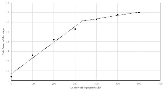 - With increasing cable prestress, the safety factor of the slope increased. However, cable prestress was not linearly correlated with the safety factor of the slope. After the prestress was increased to a certain value, the growth in the safety factor decreased until further increases in cable prestress exhibited no significant beneficial influence on the safety of the slope.