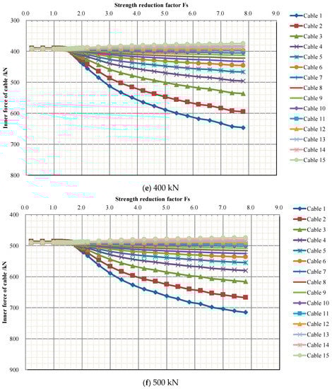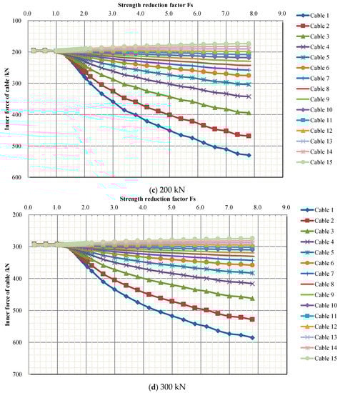 Figure 8 shows the change in forces on cables at different positions with changes in the strength reduction factor at a given prestress. It can be seen that: