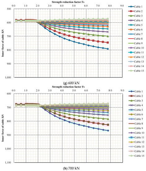 Variation of force with different strength reduction factors in certain cables. (a) Cable 1; (b) Cable 3; (c) Cable 5; (d) Cable 8; (e) Cable 10; (f) Cable 12; (g) Cable 13; (h) Cble 15.