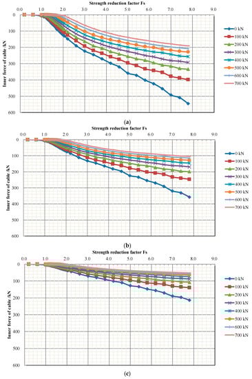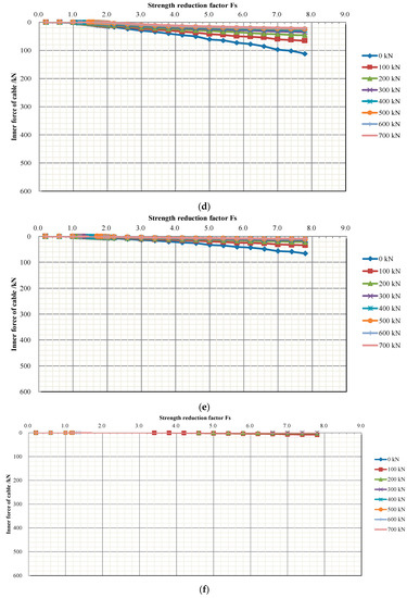 - By comparing the increments of the inner force of cables at different positions under different prestresses, it can be found that, with increasing strength reduction factor, the incremental force closer to the slope foot was larger. The force in the cables within the upper-third of the slope did not improve (see cable 12, cable 13, and cable 15) and even decreased slightly. This implied that in the sliding process of the slope, the length of cables at the upper part was not changed or slightly reduced, revealing that the cables at the upper part exhibited an insignificant reinforcing effect.