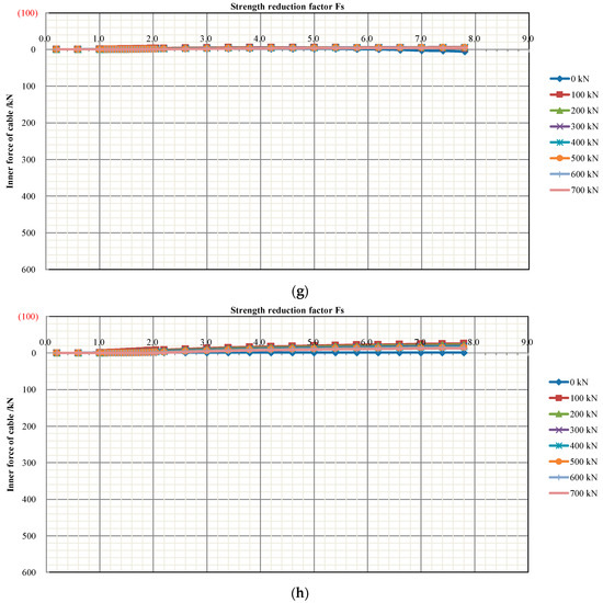 Figure 9 presents the change in incremental force (subtract of the initial prestress) in the cables at a given position under different prestresses. It should be noticed that the incremental force of some cables on the upper part of the slope becomes negative (see Figure 9g,h). This means that along the slip of the slide rock mass, the length of some cables became shorter. From Figure 9 it can be seen that: