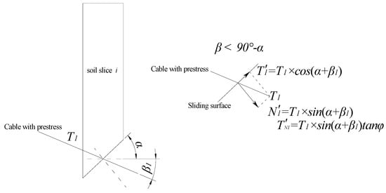 According to the aforementioned analysis, it can be seen that reinforcing the slope by using prestressed anchor cables increased the safety factor. Based on the previous understanding on the reinforcement of prestressed anchor cables on the slope, it was generally thought that on the one hand, prestressed anchor cables provided a certain sliding resistance. On the other hand, it imposed a large compressive stress on the sliding surface, thus enhancing the shear resistance thereof (Figure 10). It can be seen from the figure that cable prestress was decomposed into sliding resistance and compressive stress, with the latter being much greater than the former: however, according to previous research [11,32] prestressed anchor cables show a finite transmission range (mainly in the range of 0 to 2 m from the surface to the interior of a slope) within the slope rock and soil masses. Generally, high and steep slopes have a deep sliding surface, so using prestressed anchor cables cannot directly improve the compressive stress on the sliding surface and its shear strength cannot be strengthened as a result. As a result, this is not a reasonable explanation for any increase of safety factor of the slope caused by prestress anchor cables.