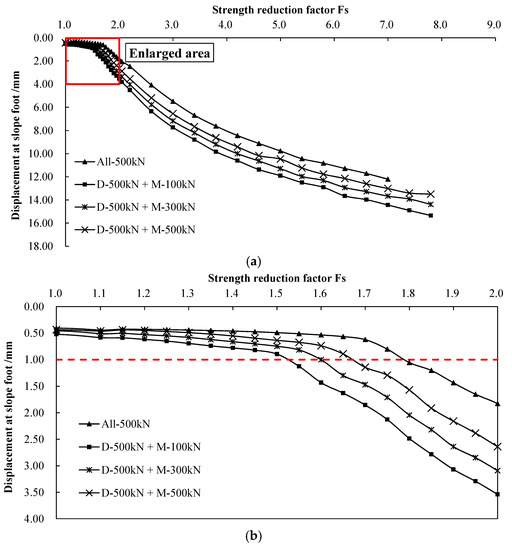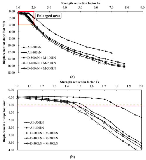 To propose an optimised reinforcement scheme of prestressed anchor cables, the slope was divided into three parts from slope foot to the slope crest: the lower third is represented by D, the middle-third by M, and the upper-third by U. Figure 11 and Figure 12 show the relationships between the displacement at the slope foot and the strength reduction factor with different numbers of cables under different prestresses. The legends All-500 kN and All-300 kN represent prestresses on all constructed cables from the lower to upper parts of the slopes as being 500 and 300 kN, respectively. The legend D-500 kN + M-100 kN means that the prestress on cables in the lower-third of the slope is 500 kN, the equivalent in the middle-third is 100 kN, and there are no cables in the upper-third. The meanings of the other legends are inferred accordingly. Figure 11b and Figure 12b are enlarged drawings of the enlarged sections in Figure 11a and Figure 12a, which helps when differentiating between the safety factors of slopes under different working conditions.