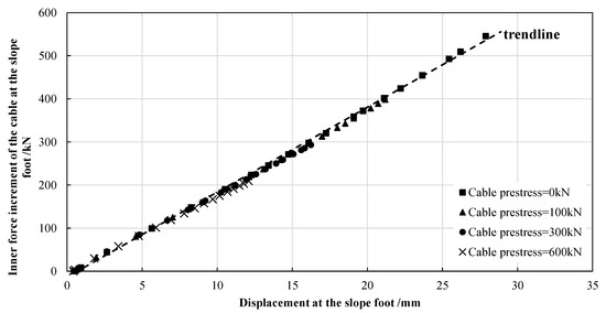 According to the aforementioned analysis, it can be seen that the incremental force in cables varied spatially, therefore, when monitoring these cable forces, the cables cannot be randomly selected but it is necessary to select specific cables at the lower part of such slopes. It is better to monitor the change in force in those cables at the slope foot. Figure 13 shows the relationship between the displacement of the slope foot and the increment in cables at the slope foot. In the figure, although cable prestresses were different, there was a linear relationship between the displacement of the slope foot and the incremental cable force at the slope foot. Therefore, the corresponding relationship between the displacement of the slope foot and the increment in the force in such cables at the slope foot can be explored in detail, thus using the incremental cable force as the index and criterion for evaluating slope stability. Afterwards, by combining multiple evaluation indices and criteria such as the displacement of slopes and the incremental cable force, the slope stability can be assessed.