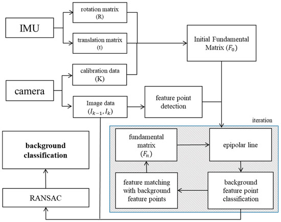 The advantage of the proposed classification method is that it can detect moving objects accurately, even in an environment where moving objects are dominating the image, which is different from previous methods. Moreover, any IMU sensor errors are substantially mitigated by the image sensor since the proposed method facilitates the complementary use of the two different sensors. The overview of the proposed background classification method is shown in Figure 2.
