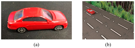 Virtual test configuration. (a) Scanned model car; (b) synthetic image modeling by 3DS Max.