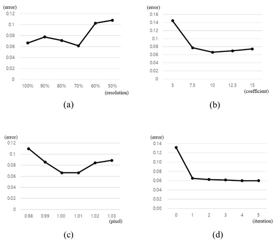 One hundred arbitrary synthetic images with 800 × 600 resolution were captured for the test. The camera calibration data and IMU data are obtained easily from the designed synthetic data. The background classification process was applied to each image with differing variables. The feature points were classified manually and used as the ground truth. The average error rates of the experimental results are shown in Figure 10.
