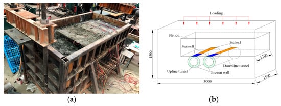 Taking the boundaries of the station and frozen walls, the size of a laboratory and the operability of a model into account, the geometric similarity ratio CL was set to be n = 1/25. Then, a steel chamber was established with a length of 3 m, a height of 1.5 m, and a width of 1.5 m on a three-dimensional platform, as shown in Figure 2a.
