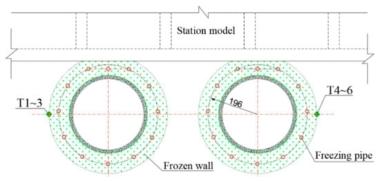 Before construction of the twin-tunnel, an initial in-situ investigation was accomplished, with soil parameters as listed in Table 1. In this project, refrigerant was chilled brine, and temperature was −28 °C []. According to the indoor experimental results, the thickness of a frozen wall was set to be 2 m. A total of 76 horizontal freezing pipes were drilled with a diameter of 108 mm, which were arranged in a circle with a radius of 4.9 m.