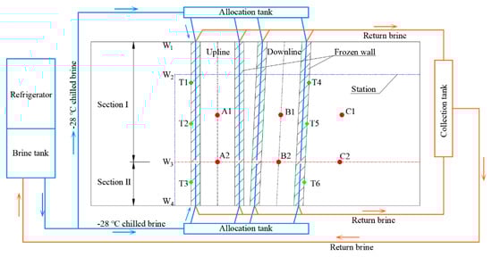 To reduce the frost heave of ground, some measures have been proposed in a number of studies, e.g., by using different freezing modes, controlling the freezing time, and lay-outing pressure release holes [,]. After weighing the feasibility against complexity of actual construction, two schemes were proposed with two different freezing modes. One is the simultaneous freezing mode, where freezing pipes were drilled from W1 to W4. The upline and downline were frozen by chilled brine simultaneously. The other is the sequential freezing mode, in which Sections I and II of the upline and downline were frozen at different times, respectively.