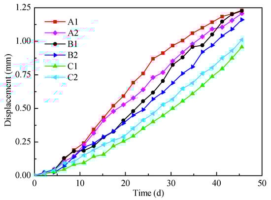 As shown in Figure 5, base slab above a frozen wall was lifted. After the process of simultaneous freezing was completed, the maximum displacement of base slab was about 1.2 mm in experiments, which is equivalent to 30 mm in the project. The deformation of base slab is larger than the permissible movement (10 mm). The lifting trends of six displacement sensors are similar. At the beginning of freezing, frost heave rises slightly, and with the freezing time increases, each frozen soil column formed by a single freezing pipe starts to connect into a frozen soil ring, causing the rapid increase of frost heave.