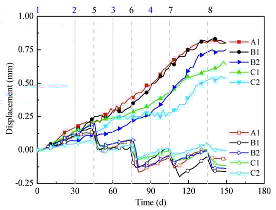 Displacement versus time in different construction processes. The dotted lines 1−4 are the start times of freezing the upline Section I, upline Section II, downline Section I, and downline section II, and the dash lines 5−8 are the start times of excavating the upline Section I, upline Section II, downline Section I, and downline Section II, respectively. Note that the senor A2 was damaged in testing without available data.