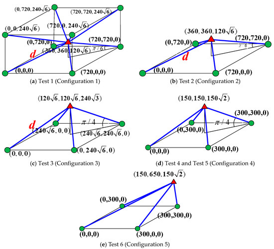 In the simulation experiment, the bias estimation is based on the Monte Carlo method, five positioning system configurations are tested, which differ in the anchor-tag positions and redundancy. The coordinates of the anchor and tag are shown in Figure 2. The distance between the tag and the anchor in Configurations 1, 2 and 3 are all the same, which is calculated to be cm. The simulated measurement error obeys the normal distribution which is an independent Gaussian variable with zero mean and equal variance. The standard deviation of the first four sets and the sixth set is 5 cm. Both the fourth and fifth set of tests are based on Configuration 4. The fifth set of test is carried out by simulating large noise with the standard deviation of 18 cm, representing the variety of the observation variance. The observation model equation is simulated 10,000 times for detecting the bias in nonlinear least-squares estimator.