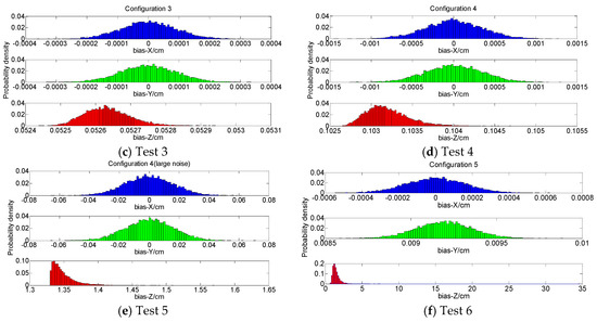 In addition, the Tests 3, 4 and 5 have the identical geometry. The difference is that Test 4 based on Configuration 4 is scaled down compared with Configuration 3 and Test 5 has larger ranging measurement noise than that of the Test 4. The bias in Test 4 is greater than that of the Test 3, and the bias in Test 5 is largest among these three sets of tests. The results verify that the bias is inversely proportional to the ranging distance and directly proportional to the ranging error.