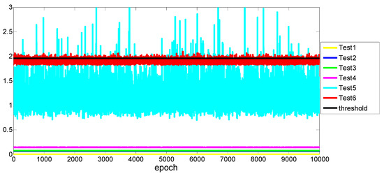 To check if the parameter estimator bias is too large, the hypothesis test based on Mahalanobis distance is implemented. It is used to assess whether the linearized model is a sufficient approximation. The results of six sets of tests and the threshold are compared in Figure 5. We can see that the test statistic of the first four sets of tests are all very small, the latter two sets of tests are very large, and some epoch data exceeds the threshold. It indicates that the bias of some epoch in Tests 5 and 6 are too large and the linearized model is not sufficiently approximate for UWB positioning. The bias is only intolerable for the relative large ranging error and ill-conditioned system geometry. The positioning system performances be ranked as Configuration 1 > Configuration 3 > Configuration 2 > Configuration 4 > Configuration 4 (large noise) and Configuration 5, from good to poor. Furthermore, the statistics of bias correction are listed in Table 1. It can be known that the bias correction effect in the coordinate component x and y can be ignored, and it is obvious in the coordinate component z. We can believe that it is more effective to use second-order bias correction when the measurement precision is relatively low or the configuration is bad.