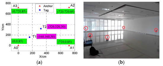 The main goal of this test is to evaluate the bias of least-squares parameter estimator under a static situation. The locations of test points and anchors and the experimental scene are shown in Figure 6. The positions of test points were calibrated ahead of time. In the test, 300 epoch data was sampled at each test point.