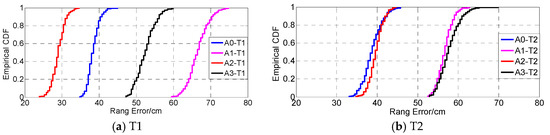 Figure 7 represents the cumulative distribution function (CDF) of the ranging error of all the measurements collected. It can be observed that the random error of these observations are small and differ slightly. However, all of their systematic errors are very large. The distance between T1 to A1 perfectly matches the distance between T1 and A3, but the range estimation accuracy is different due to the hardware. Although the hardware devices adopt the principle of TWR without a common time reference, the clock drift and offset still affect the ranging error. We can also see that the systematic error based on anchor A1 and A3 becomes larger than that based on anchor A0 and A2.