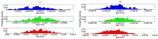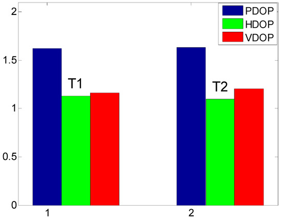 The frequency histograms of the parameter estimator bias are given in Figure 8. The average PDOP, HDOP and VDOP for two test points are shown in Figure 9. The anchors are uniformly distributed on a planar ground. The two test points constitute two different positioning configurations with anchors. The three kinds of DOP values of T1 and T2 have minor difference. It indicates that their positioning configuration is close. Meanwhile, it can be seen that the coordinate components are all biased. It indicates that the corresponding component does not satisfy the orthogonal condition with the zero bias.