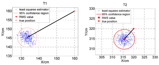As is shown in Table 2 and Figure 10, the hypothesis test is implemented to check the parameter estimator bias. The bias of two test points in the coordinate component z is much larger than x and y. Because the anchors are distributed in a plane. It makes known that the positioning configuration is symmetrical in the x and y direction, but it is ill-conditioned in component z. The bias in the coordinate components x and y and the Mahalanobis distance at T1 are larger than that of T2. In the x-y plane, the geometry of T2 is closer to the orthogonal condition with the zero bias. It indicates that the test point T2 and anchors constitute a better positioning geometry. Meanwhile, we can see that the test statistic of two tests are both very small compared with the threshold value. It shows that the bias is small enough to be neglected and the linearized model is a sufficiently approximate for UWB positioning. Figure 11 illustrates the parameter estimators in x-y plane with 95% confidence region. It shows that the systematic error of the parameter estimators of at T1 is greater than T2. It makes known that a good geometry can not only reduce the bias caused by the inaccurate functional model, but also compensates for the systematic error due to the hardware devices used.