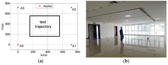 The main goal of this test is to evaluate the bias of least-squares parameter estimator in a dynamic situation. The coordinates of anchors are consistent with the static positioning. The test trajectory and the experimental scene are shown in Figure 12. The tester walked along the predetermined trajectory. Besides, an additional set of test analysis is implemented by adding large noise with the standard deviation of 20 cm to the original observations. It stimulates non-line-of-sight (NLOS) environment, the error of measurements increased.