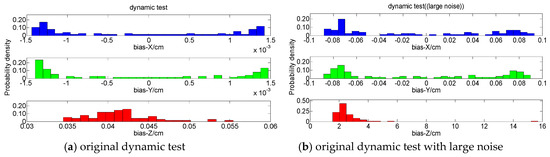 The frequency histograms of parameter estimator bias are shown in Figure 13. Since the anchors and trajectory are all symmetrical in the horizontal direction, the bias in the coordinate components x and y are also basically symmetrical. The bias in the coordinate component z is also greater as before. Besides, since the dynamic motion process on the preset trajectory does not satisfy the orthogonal condition of the design matrix and the bias amount of nonlinearity. The bias in the coordinate components x and y is not unbiased and the probability of large bias in the coordinate components x and y is larger than that of small bias. Furthermore, the bias of all coordinate components in dynamic test with large noise is larger than that of original dynamic test.