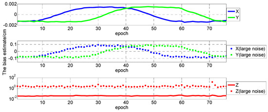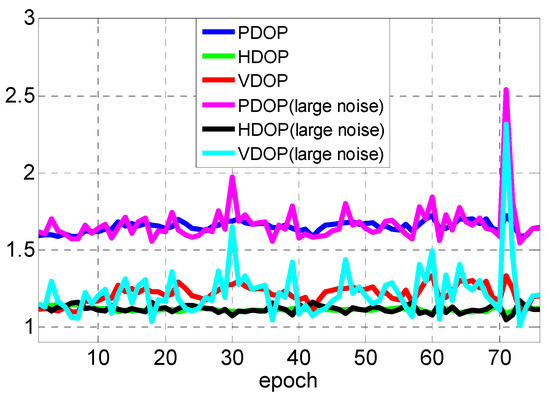 Moreover, as is shown in Figure 14, the noise will influence the observations, which in turn affects the stability of the system geometry and the calculation of DOP value. Furthermore, these factors together affect the calculation of parameter estimator bias. Figure 15 and Figure 16 demonstrate that the large noise in NLOS environment directly affects the magnitude of the bias in the nonlinear least-squares estimator, and the Mahalanobis distance of many epochs have exceeded the threshold. We can believe that the bias estimate can be used to correct the least-squares estimator to guarantee the unbiasedness for UWB positioning. For the relatively high measurement precision and good positioning configuration, the linearization is valid and the bias can be neglected.