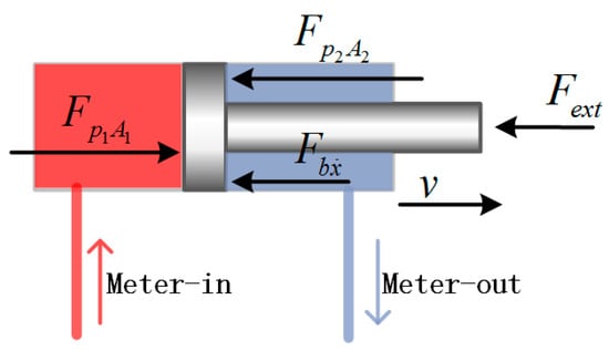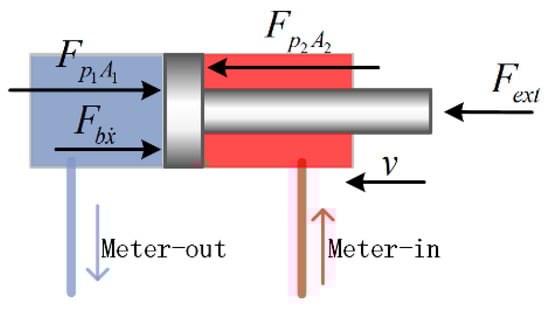 Damping is the effect that tends to reduce the amplitude of vibrations [15], which means that the damping force always has the opposite direction with velocity. The pressure force at the metering-out chamber can be regarded as a damping force. As shown in Figure 2, when the rod is extending, the direction of the metering-out pressure force is opposite to the rod moving direction, and there is a tendency to hinder the movement of the piston, so that the metering-out pressure force can be considered as a kind of damping for the system. The viscous damping force is also opposite to the speed direction and it is also the damping force of the system. Similarly, when the piston is retracted, as in Figure 3, the direction of the metering-out pressure force is opposite to the rod moving direction, so the metering-out pressure force is a damping force of the system.
