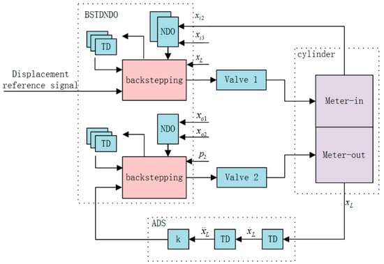 Based on the above research, the robust backstepping controller combining with a tracking differentiator (TD) and a nonlinear disturbance observer (NDO) is proposed in this section, which is called BSTDNDO for short. The BSTDNDO is used to control the cylinder to track the reference signals. TD is applied in the controller to avoid “computational explosion”. The NDO is used to compensate for the uncertainties and disturbances. Figure 6 shows the structure of the proposed controller.