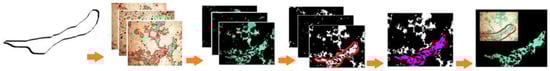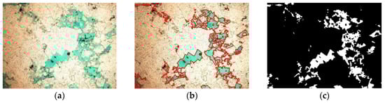 As many as 880 images presenting a variable degree of porosity were included in the study. Once loaded, the porosity detection method described in Section 3.2 was applied. It leads to the segmentation of the areas distinguished by the blue colour obtained by soaking the sample in resin.