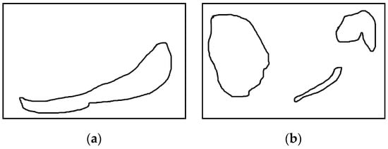 In the context of the matter in question, a sketch of an image is understood as a digital image on a white background, where the edges mark the areas of the objects which are to be further analysed. The proposed method standardises the drawn sketch in relation to the background (known as canvas); therefore, no boundary conditions are set in the form of sketch dimensions. Two types of queries are considered. The first query is for the retrieval of the most similar object—in this case, the search query should be a sketch of a single object (Figure 2a). In order to retrieve images with the best matching pore space distribution, a search query with at least two objects indicating the porosity intensity through their distribution is taken into account (Figure 2b).