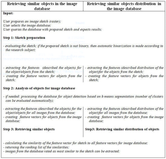 There are different forms of posing a query by image. In general, a query can be specified by means of an example of an image (QBIC—Query by Image Content, QBE—Query by Example), by an example of a group of images (QBGE—Query by Group Example), and by means of a simplified sketch of the image (QBS—Query by Sketch, or QBC—Query by Canvas) [12,13,14,15,16]. These methods are founded on the principal assumptions of the CBIR methodology, where both the search query and the database of the images explored are processed in order to extract their characteristic features, which are then compared and adjusted according to set criteria [17].