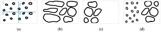 Having a database that includes thousands of images we might need to retrieve an image (and in a result, a rock or a piece of the rock mass) with a given distribution of objects (porosity). Such images could be for example those presented in Figure 5 and which are the sketches of images with the porosity created by small pores (a), the sketches of porosity created by large pores (b), sketches with porosity created by large pores next to the lack of porosity (c) or those with high porosity created by small pores next to high porosity created by large pores (d). Searching databases with the purpose of retrieving the described situations can be performed by providing a mathematical description of such structure and then searching the entire database to find an image which is the closest to this description. However, according to the authors, this task is difficult and requires engagement of a specialist that is able to prepare such mathematical description. This is why we recommend another method, which is based on Query by Sketch.