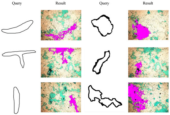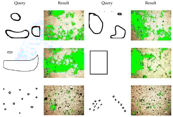In this method, when retrieving porosity by drawing large areas in the appropriate part of the image, we obtain images from the database with a similar porosity distribution. A functional effect can therefore be achieved: “return all images with a similar pore fill rate in a given part of the image, as on the sketch”. Figure 7 presents images with the best match from the database under analysis (880 images). The result of processing the query is also presented, as described in Section 3.1.