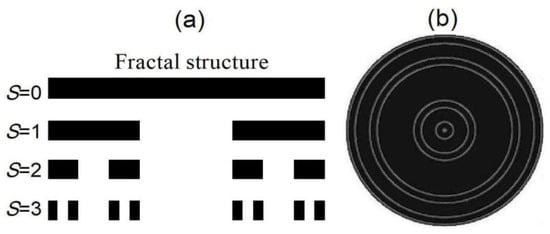 Fractal conical lens (FCL) is known as a more general diffractive optical device than conical lens (CL), which has a rotational symmetric structure and special radial phase envelope designed following a kind of Cantor set (CS) of a certain stage S [22,23]. In order to visualize the structure of a FCL, Figure 1a plots the schematic of a one-dimensional (1-D) fractal structure of a FCL following the triadic CS, and Figure 1b presents the two-dimensional (2-D) fractal structure of a FCL (S = 3) based on the triadic CS. Here, it is notable that a CS other than triadic could also be formed with a similar process.