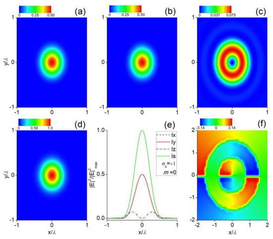 In terms of the analytical expression derived above, we graphically illustrate the tight focusing characteristics of circularly polarized optical vortex in cases with and without a FCL. Figure 2a–c, respectively, plot the intensity distributions of x-polarized component, y-polarized component, and z-polarized component |Ei|2 of a strongly focused RHC polarized Gaussian beam (σz = +1, m = 0) without a FCL. For a RHC polarized Gaussian beam (σz = +1, m = 0), it can be seen from Figure 2a–c that in the focal plane, both x-polarized component and y-polarized component present peak-centered intensity distributions, whereas the z-polarized component forms a donut-shaped configuration. Thus, the total intensity distribution forms an on-axis-maximum profile (Figure 2d). These intensity distributions are also clearly verified from the transverse line scans through the focus (see Figure 2e). It is of great interest to find from Figure 2f that the phase of the z-polarized component presents a helical structure, which indicates that through strongly focused optical system, the targeted light beam has become an optical vortex even though the incident light beam does not possess a vortex. This phenomenon occurs because, through a highly focused optical system, partial SAM of the incident circularly polarized light field could be transferred to OAM, which leads to a helical phase of the longitudinal component of the focal electric field.