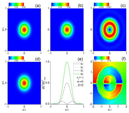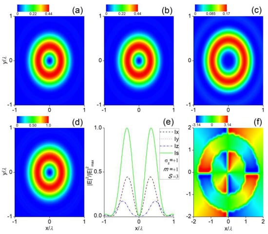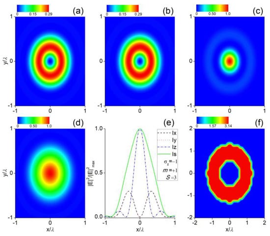 Figure 4 depicts the strongly focused RHC polarized optical vortex (σz = +1, m = 1) with a FCL of stage S = 3. In this case, the x-polarized component, y-polarized component and z-polarized component all present donut-shaped intensity distributions. As a result, the total intensity demonstrates a dark-centered distribution. In addition, the magnitude of x-polarized component and y-polarized component are identical, and meanwhile the z-polarized component’s magnitude becomes much larger when compared with Figure 3. This phenomena can be explained as follows: for the RHC polarized vortex (σz = +1, m = 1), in the focal plane, the double helical phase appears (where in Equation (6)) when the directions of the helical phase and circular polarization are the same, and it can be verified from the phase helical phase distribution of z-polarized electric field in Figure 4f. In addition, the dark hollow radius of the longitudinal polarized component depends on the topological charge, therefore, the dark area in Figure 4c becomes much wider than that in Figure 3c.