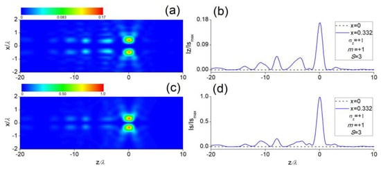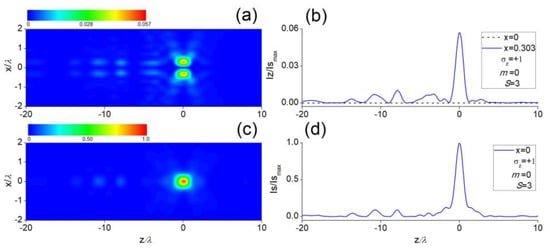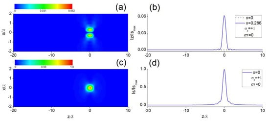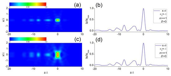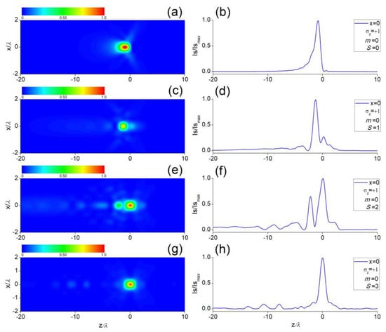 Figure 6 shows the evolution of the z-polarized component intensity Iz (upper row) and the total intensity Is (lower row) (2D left column, and 1D right column, the Figure 7, Figure 8, Figure 9 and Figure 10 are the same) of strongly focused RHC Gaussian beams without a FCL. As can be noted from Figure 6a,b, for the strongly focused Gaussian beam (σz = +1, m = 0), the z-polarized component produces an on-axis null along the z-axis, whereas the total intensity reaches its maximum in the focal point (see Figure 1c,d). Additionally, both the z-polarized component intensity and the total intensity have symmetric distributions about the focal point.