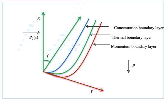 Over the last few decades, scholars have paid prodigious attention to the boundary layer flows towards stretching inclined surfaces. The primary reasons behind such substantial thought is their mechanisms and uses. This commitment to the investigation of boundary layer flows is due to their vast utilization in industries, technology, and engineering such as the extrusion of plastic sheets, glass fiber production, crystal growing, hot rolling, wire drawing, metal and polymer extrusion, and metal spinning. Ramesh et al. [21] examined the boundary layer flow towards a slanted sheet. Abo-Eldahab et al. [22] studied the energy transport towards an extending slanted sheet. Rehman et al. [23] investigated the heat and mass exchange flow through an inclined surface. The flow of Powell–Erying fluid towards an inclined surface by incorporating the radiation impact was examined by Hayat et al. [24]. Recently, Tlili [25] studied the flow of Jeffrey fluid towards a slanted sheet by incorporating the heat generation effect.