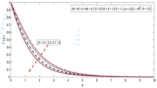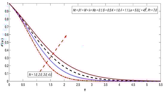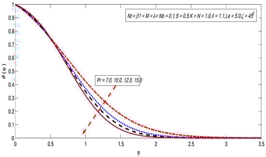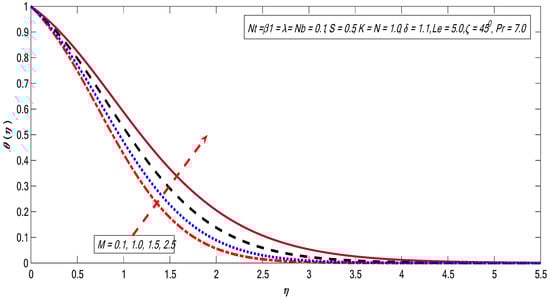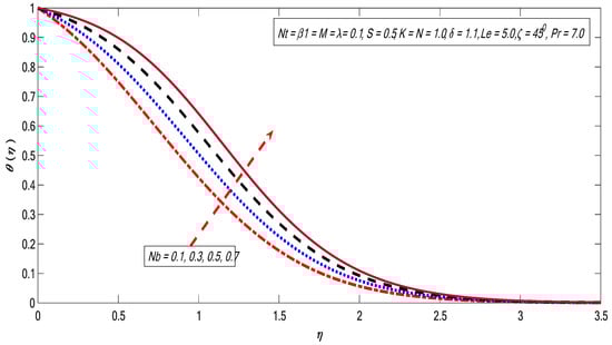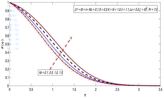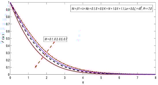 Figure 10, Figure 11, Figure 12, Figure 13 and Figure 14 are plotted to get insight into the variations of and on the temperature profile. The magnetic field strength shows favorable behavior for the temperature profile in Figure 10. Here, hydromagnetic case is stronger than the hydrodynamic case (). It can be observed that the thickness of the thermal boundary layer thickness improves with growth in [41]. Figure 11 illustrates the behavior of temperature profile against the variations in the Brownian motion factor. Brownian motion is an irregular movement of the fluid particles which produces collisions among the particles. Therefore, the heat of the fluid increases with growing the Brownian motion impact. Consequently, free surface nanoparticle volume fraction reduces. The variations in increase the temperature profile (see Figure 12). The restrictions on the thermophoresis favor the rise of the surface temperature. The irregular movement (Brownian motion) produces kinetic energy because of nano suspended particles that cause an enhancement in the temperature; consequently, thermopheretic force develops. Due to the intensity generated by this force, the fluid starts in the reverse direction of the extending sheet. Finally, an enhancement in causes an improvement in temperature; as a result, the surface temperature also increases. The effect of Prandtl number on temperature profile is presented in Figure 13. The ratio of momentum diffusivity to thermal diffusivity is termed the Prandtl number. It is a well-known fact that higher thermal conductivities are linked with lower Prandtl fluids; therefore, heat diffuses rapidly from the surface compared to higher Prandtl fluids. Thus, Pr can be employed to control the rate of cooling in conducting flows [42]. Finally, the temperature profile decreases with the growth of Prandtl number. Figure 14 shows that the favorable behavior corresponds to the radiation effect. The higher surface heat flux rate corresponds to the higher radiation impact, causing the fluid to be warmer.