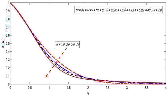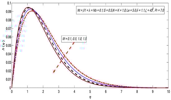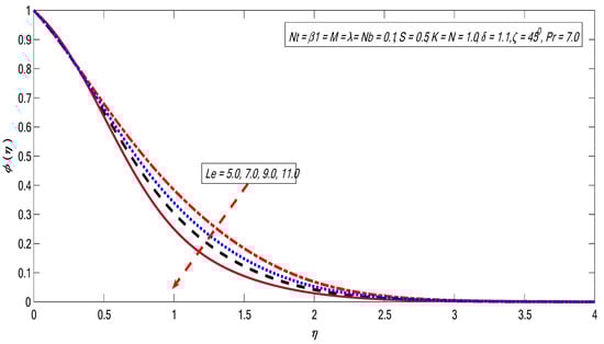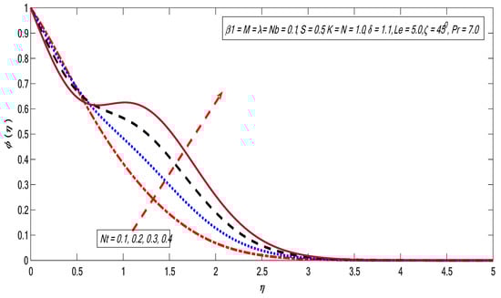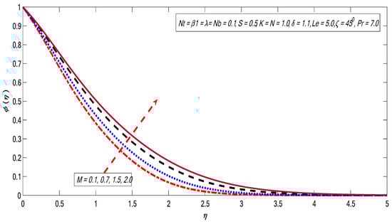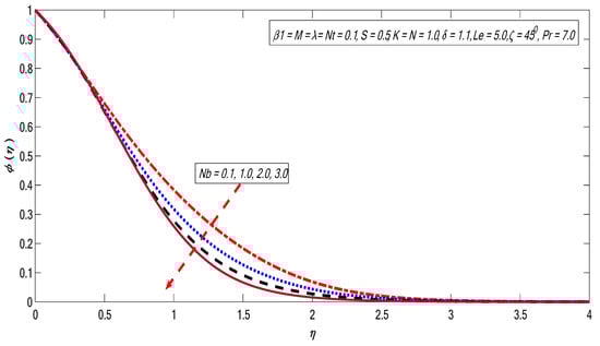 Figure 15, Figure 16, Figure 17, Figure 18 and Figure 19 represent the variations of and on the concentration profile. The magnetic field strength plays a favorable role for the concentration profile (see Figure 15). As discussed earlier in the case of velocity profile, the magnet field produces the Lorentz force, thus creating resistance, which causes improvement in the thermal and concentration boundary layer thicknesses. Figure 16 exhibits the Brownian motion effect on the concentration profile. It is noticed that the concentration outline decreases with the growing magnitude of the Brownian motion impact. The boundary layer thickness is moderated by the enhancement in Brownian movement, which is the reason for the reduction of concentration profile. The thermophoretic effect boosts the concentration field (see Figure 17). This is due to the fact that the molecular kinetic energy of the fluid particles is enhanced by enhancing the thermophoretic impact. The variation in radiation impact causes the reduction in the concentration field (see Figure 18). The effect of Lewis number is demonstrated in Figure 19. It is noticeable that the concentration profile falls with the improvement of the Lewis number. The boundary layer viscosity decreases when the values of Lewis number are improved.