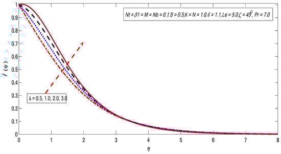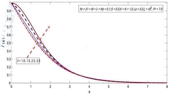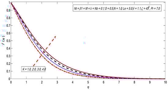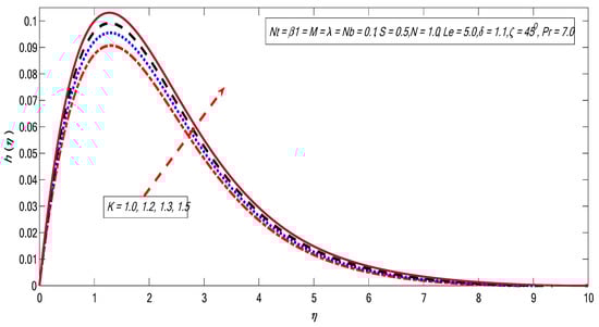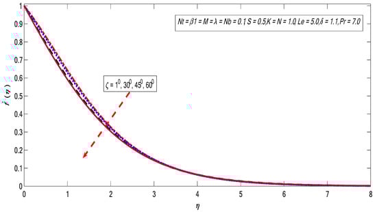 Figure 2, Figure 3, Figure 4, Figure 5, Figure 6, Figure 7, Figure 8 and Figure 9 are depicted to show the physical behavior of , , , , and on velocity profile. The variations of on the velocity is exhibited in the Figure 2. As expected, the velocity of the fluid flow become lower with the strengthening of the magnetic field. It is an agreement with the fact that growth in causes Lorentz force that creates resistance to the flow, due to which the momentum boundary layer thins across the boundary. A similar effect is shown in Figure 3, contradicting the variation in . The angular velocity shows inverse relation with the magnetic field strength. The variations in material parameter show the velocity profile upturn (see Figure 4). The variation in angular velocity contradicts the material parameter portrayed in Figure 5. Clearly, increases with growing magnitudes of on matching with the Newtonian case (); additionally, the boundary layer thickness reduces with growth of . The relation between and the velocity field is depicted in Figure 6. Here, presents the characteristics of the buoyancy forces, which offer a direct relation with the velocity field. Physically, the growing magnitude of the buoyancy forces causes a decline in the viscous force, which improves the fluid flow, which causes faster motion. Moreover, the relationship between the solutal buoyancy forces and velocity field is shown in Figure 7. Physically, the length, concentration difference, and kinematic viscosity of the fluid affect parameter . On the other hand, there is an inverse relationship between the viscosity and velocity of the fluid. Therefore, the viscosity of the fluid declines once it has increased the magnitude of (which as a result causes faster the motion), and the concentration upsurges directly, due to which the velocity field rises. Finally, a direct relationship between factor and the velocity outline is shown. Figure 8 presents the inclination variation in the velocity field. It can be observed that there is an inverse relation between and . This can be ascribed to the fact that the maximum gravitational force acts on flow when the inclination factor because in this state the sheet will be vertical. However, for the sheet will be horizontal, which causes the reduction in the velocity profile as the strength of the bouncy forces decline. The variation in Brinkman factor causes a decline in the velocity profile (see Figure 9). Parameter is the ratio between the drag force and density; therefore, by increasing the drag force improves and the fluid velocity reduces [40].