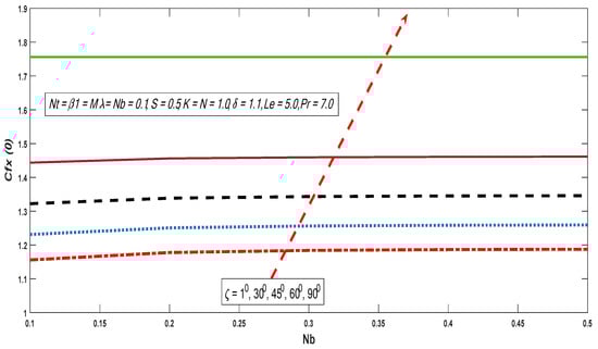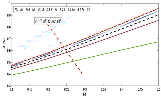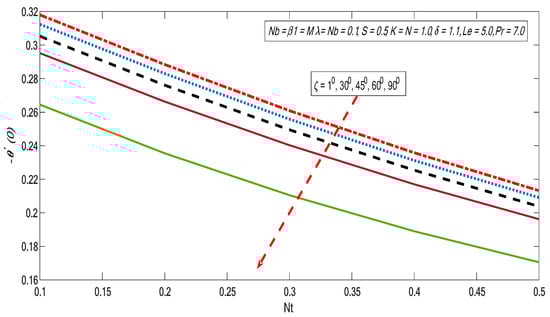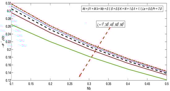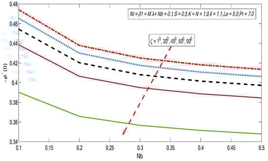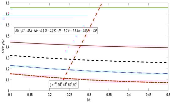 Behaviors of heat and mass exchange rates along with skin friction are presented in Figure 20, Figure 21, Figure 22, Figure 23, Figure 24 and Figure 25 for altered values of and . Figure 20 and Figure 21 demonstrate that the heat and mass exchange rates are reduced with growth of inclination and Brownian motion impact. On the other hand, the skin friction improves when the Brownian motion and inclination effect portrayed in Figure 22 are increased. Similarly, the heat and mass exchange fluxes fall against the growing magnitudes of thermophorectic and inclination parameters (see Figure 23 and Figure 24). Moreover, wall shear stress is enhanced with the growth of inclination and thermophoretic impacts (see Figure 25).