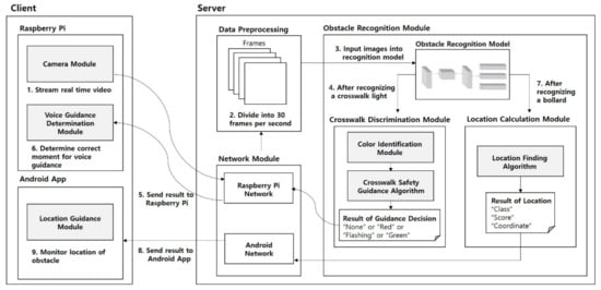 This section describes the system architecture (Figure 1) in which the system works. First, the Raspberry Pi was capable of streaming videos in real time. Streamed videos were imported to the server using a network module. These images were divided into 30 frames per second in the data processing. The obstacle recognition module was the main module in the system. It recognized obstacles in the images using an obstacle recognition module based on the retraining, and then it executed either the crosswalk discrimination module or location calculation module. Each of the divided images from the Raspberry Pi were input into the obstacle recognition model (Step 3, Figure 1) to recognize crosswalk lights and bollards. Images that were recognized as crosswalk lights were then input into the crosswalk discrimination module (Step 4).