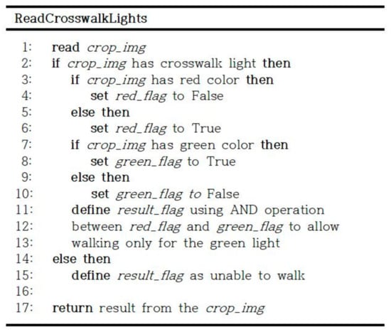 Crosswalk light discrimination occurred after a crosswalk light was recognized as being as such in the obstacle recognition model (Figure 2). If the object was indeed recognized as a crosswalk light, the image was cut into the part corresponding to the crosswalk light, and then input into the algorithm as crop_img. In the process of lines 3–10, a red or green color could be detected using the detection color function. If a green color was detected, red_flag turned False, which meant that the client could not cross the crosswalk in the algorithm. In lines 11–13, if red_flag (set to True when red color was absent) and green_flag were True then result_flag became True. This indicated that the client could cross a road via the crosswalk. In contrast, if result_flag became False, it meant that the client must stop and wait.
